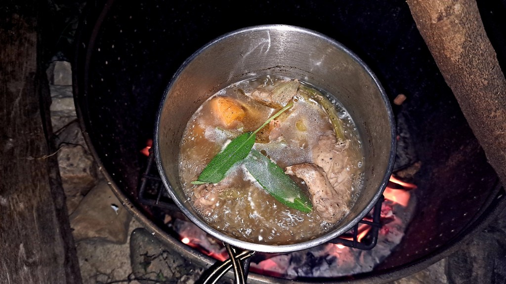 It hadn’t rained in some time in my small part of the world so the fire was rather simple to ignite. I sat in my chair and watched the stillness of the woods as the coals readied for cooking. I also grabbed a few fresh sage leaves to add in the pot.