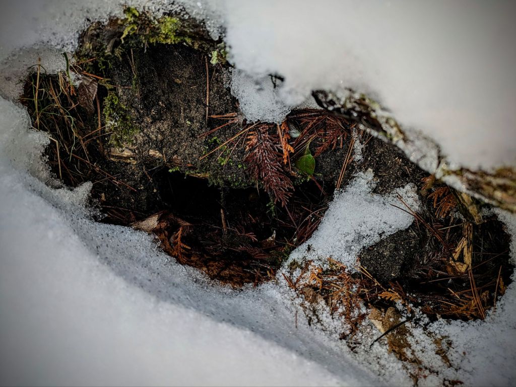I do a lot of hiking and woods walking in Indiana and Michigan. Sometimes I’m looking up at the sky, fascinated by how vast it is and colorful. Most of the time I’m looking in places most don’t think about as they pass by. Those small crevices under roots and decaying logs. At a hole in a tree. A fallen branch covered in leaves sticking out of the snow to create a cave.